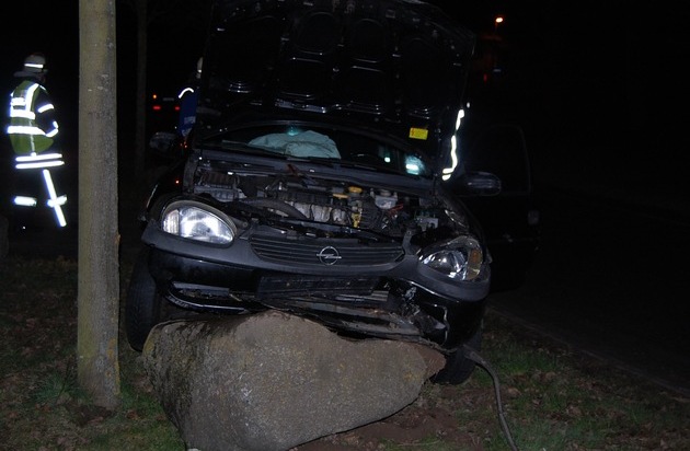 Größere Steine stoppten die Fahrt eines Kleinwagens am gestrigen Mittwochabend in Glanbrücken abrupt. Der aus dem Ortsteil Hachenbach kommende Opel kam aus bislang unbekannter Ursache von der Fahrbahn ab, überfuhr einen größeren Findling und setzte auf dem zweiten auf. Durch die ausgelösten Airbags erlitt der Fahrer Schürfwunden im Gesicht, blieb aber ansonsten unverletzt. Der 84-Jährige konnte nach kurzer ambulanter Behandlung im Krankenhaus wieder entlassen werden. Möglicherweise waren körperliche Mängel zumindest mitursächlich für den Unfall. Entsprechende Folgeermittlungen werden noch angestellt.
