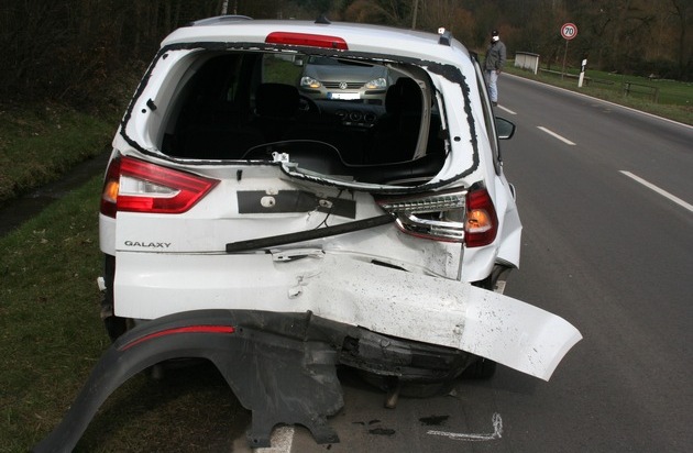 Vier Verletzte und zwei total beschädigte PKW sind die Folgen eines Auffahrunfalles vom Donnerstagnachmittag. Zwei Kinder im Alter von 5 und 13 Jahren sowie deren 44-jährige Mutter wurden vorsorglich im Krankenhaus untersucht. Auch der 22-jährige Unfallverursacher wurde zur Behandlung von Prellungen ins Krankenhaus gebracht. Der 22-Jährige war mit seinem VW-Passat fast ungebremst auf den vor ihm im Abbiegen befindlichen Ford-Galaxy aufgefahren. Die beiden Fahrzeuge befuhren, um 14:18 Uhr, hintereinander die B 270 von der Einmündung an der "Palatia" in Richtung Wolfstein. Die 22-Jährige verringerte schließlich ihr Tempo und wollte nach links zum Lammelsbacherhof abbiegen. Der nachfolgende junge Fahrer hatte im entscheidenden Moment, nach eigenen Angaben, zur Seite geschaut und nicht rechtzeitig wahrgenommen, dass das vor ihm befindliche Fahrzeug abgebremst wurde. Erst im letzten Moment hatte er noch einen Bremsvorgang einleiten können, krachte allerdings mit erheblicher Wucht auf den Ford Galaxy. Der Sachschaden wird auf insgesamt 20.000 Euro geschätzt. Die den Unfall aufnehmenden Polizisten gehen davon aus, dass alle Beteiligten viel Glück hatten, dass nichts Schlimmeres passiert ist. Unter Würdigung der Unfallschäden waren hierfür die Benutzung der Rückhalteeinrichtungen und die gute Verarbeitung der Fahrzeugkarosserien ausschlaggebend.