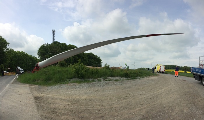 Insgesamt 96 Tonnen Last schoben sich am Vormittag durch die Verbandsgemeinde. Vom Parkplatz In der Heimbach war der Transport eines Rotorblattes gegen 9 Uhr in Meisenheim gestartet. Mit einem 71 Tonnen schweren, selbstfahrenden Spezialfahrzeug wurde das etwa 60 Meter lange Rotorblatt eines Windrades über die Bundesstraße 420, die Kreisstraße nach Desloch hoch und weiter in Richtung Lauschied transportiert. Das Rotorblatt war das erste von mehreren Bauteilen, die für die Errichtung eines Windrades im Windpark bei Bärweiler benötigt werden. Im Schneckentempo ging es auf acht Achsen durch Desloch. Zahlreiche Schaulustige verfolgten das Geschehen. Unter Hochspannungsleitungen hindurch, an engen Mauern vorbei und durch enge Kurven - um nirgends anzustoßen und auch Engstellen entsprechend zu meistern, konnte das Spezialfahrzeug das Rotorblatt aufrichten beziehungsweise drehen. Gerade so, wie es passte. Millimeterarbeit war gefragt, bis der Koloss gegen 12 Uhr sein Ziel erreichte. Mehrere Polizeistreifen waren im Einsatz und sicherten den Transport ab. Bundes- und Kreisstraßen wurden gesperrt. Nächste Woche soll es weiter gehen, dann sind die übrigen Bauteile dran und es ist wieder mit Straßensperrungen zu rechnen. Eine Umleitung ist ausgeschildert.
