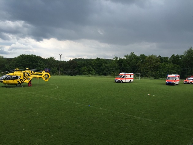 Am heutigen Samstag wurde auf dem Sportplatz des SV Eintracht Hoppstädten das Fußballspiel der E-Junioren zwischen der SG Perlbachtal und der SG Meisenheim durchgeführt. Direkt nach Abpfiff der Begegnung um etwa 14 Uhr schlug plötzlich ein Blitz auf dem Rasenspielfeld ein. Getroffen wurde in erster Linie der Schiedsrichter des Jugendfußballspiels. Außer ihm gingen direkt zwei weitere Betreuer der Mannschaften zu Boden. Durch Zuschauer wurden direkt Erste-Hilfe-Maßnahmen ergriffen und ein Notruf abgesetzt. Anschließend wurde ein großer Rettungseinsatz eingeleitet, in dessen Verlauf zwei Rettungshubschrauber, zwei Notarztwagen und fünf Rettungswagen im Einsatz waren. Ebenso waren sämtliche umliegende Feuerwehreinheiten, der Katastrophenschutz sowie die Polizei im Einsatz. Der vom Blitz direkt getroffene 45-jährige Schiedsrichter erlitt direkt einen Herz-/Kreislaufstillstand und musste reanimiert werden. Dies wurde zunächst von Zuschauern, später vom Notarzt durchgeführt. Er wurde von einem Rettungshubschrauber in ein Krankenhaus geflogen. Ebenso wurde ein schwer verletzter 48-jähriger Betreuer mit einem Rettungshubschrauber ins Krankenhaus gebracht. Mit einem Rettungswagen musste mit schwereren Verletzungen auch ein 47-jähriger Betreuer in ein Krankenhaus gefahren werden. Alle 29 Kinder im Alter zwischen neun und elf Jahren, die zuvor an dem Fußballspiel teilgenommen hatten, wurden ebenfalls in verschiedene umliegende Krankenhäuser gebracht. Hierbei handelte es sich allerdings laut Rettungskräften um eine reine Vorsichtsmaßnahme, was auch für den Krankenhausaufenthalt eines weiteren Zuschauers gilt. Zu betonen ist abschließend, dass der Blitz sprichwörtlich "aus heiterem Himmel" auf dem Sportplatz einschlug. Sämtliche Anwesende gaben übereinstimmend an, dass dies nicht vorherzusehen und der Himmel nicht bewölkt gewesen sei.
