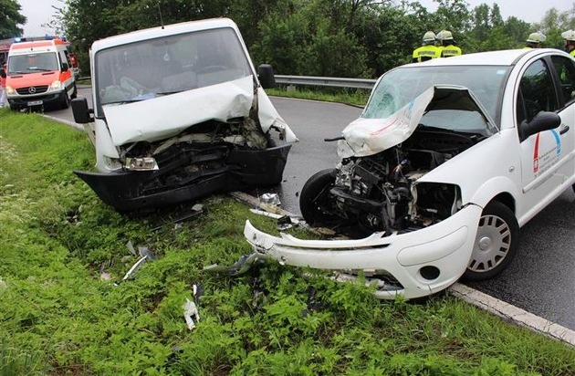 Ein Frontalzusammenstoß zwischen zwei Fahrzeugen ereignet sich in am Mittwoch Nachmittag. Ein 52jähriger Pkw-Fahrer befuhr die B 423 von Brücken kommend in Fahrtrichtung Schönenberg. Im Scheitelpunkt einer Rechtskurve verlor er auf regennasser / seifiger Fahrbahn die Kontrolle über sein Fahrzeug und schleuderte frontal in einen entgegenkommenden Kleintransporter. Beide Unfallbeteiligte wurden schwer aber nicht lebensgefährlich verletzt und mussten in umliegende Krankenhäuser eingeliefert werden. An den beteiligten Fahrzeugen entstand wirtschaftlicher Totaschaden in Höhe von ca. 12000 Euro. Die B 423 musste für die Zeit der Unfallaufnahme und Reinigungsarbeiten (ca. 3 Stunden) voll gesperrt werden. Feuerwehr VG Schönenberg war mit 30 Kräften im Einsatz. Lichtbilder anbei