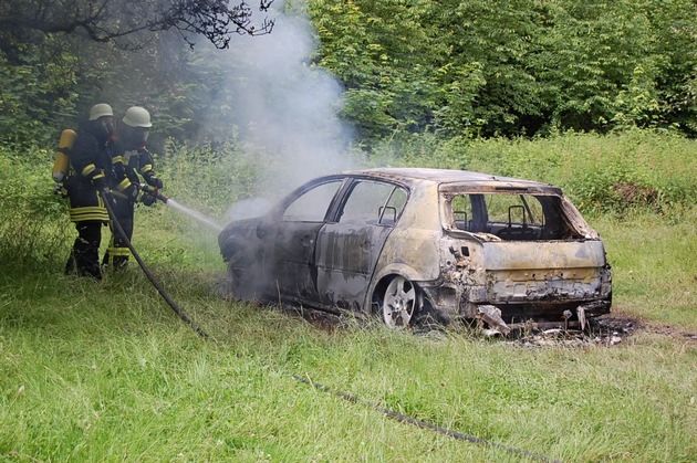 Ein PKW, Opel - Signum, ist am Montagmorgen zwischen Medard und Löllbach total ausgebrannt. Hinweise auf ein Fremdverschulden liegen nicht vor. Der Fahrzeughalter hatte den Wagen gegen 8 Uhr auf einer Wiese neben einem Feldwirtschaftsweg abgestellt. Als er kurz nach 10 Uhr von Arbeiten auf einem Grundstück in der Gewanne "Weiherresch" zurückkam, stand der PKW in Flammen. Der 64-jährige Mann hatte kein Handy dabei und musste zur Verständigung der Feuerwehr in den Ort laufen. Die Feuerwehren aus Medard und Lauterecken waren mit drei Fahrzeugen und 14 Kräften im Einsatz. Nach ihrem Eintreffen konnten sie das verbliebene Fahrzeugwrack nur noch abkühlen. Der Schaden wird auf 5.000 Euro geschätzt. Die Fahrzeugversicherung will zur Abklärung des Schadens einen Sachverständigen beauftragen.