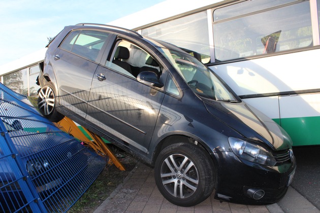 52-jähriger Busfahrer befuhr den Kreisel, welcher die Industriestraße und die Bezirksamtsstraße in Rockenhausen miteinander verbindet. Er war Fahrer eines Linienbusses, welcher zum Unfallzeitpunkt ca. 35 Kinder zu den in Rockenhausen ansässigen Schulen beförderte. Beim Herausfahren aus dem Kreisel,um auf die Bezirksamtsstraße abzubiegen, wurde vermutlich wegen nicht angepasster Geschwindigkeit der Kurvenverlauf nicht eingehalten. Der Bus fuhr über den angrenzenden Bordstein und den Grünstreifen und kollidierte mit dem Pkw einer 50-jährigen Frau, welche gerade mit ihrem Pkw auf den Einmündungsbereich des Kreisels zufuhr. Der Bus erfasste den Pkw im Bereich der linken Fahrzeugseite und schob diesen rückwärts parallel zur Fahrspur des Busses auf den angrenzenden Zaun eines Grundstückes. Dort blieb der Pkw rückwärts auf dem Zaun hängen. Der Linienbus kam etwa 6 m im Gelände der dort ansässigen KFZ-Werkstatt zum Stehen. Beide Fahrzeugführer wurden leicht verletzt. Der Gesamtschaden beläuft sich auf nahezu ca. 50.000 Euro, da durch den Unfall auch geparkte Fahrzeuge auf dem Werkstattgelände und dem Gelände des benachbarten KFZ-Betriebes ebenfalls beschädigt wurden. Die Überprüfungen, ob Kinder verletzt wurden, dauern z.Zt. noch an, da noch vor Verständigung der Polizei vom Busfahrer ein Ersatzbus, welcher die Kinder zu den Schulen beförderte, organisiert wurde.