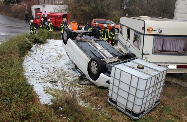 Eine 26jährige Pkw-Fahrerin kam am Sonntag, 29.01.2017 gegen 10.00 Uhr auf der abschüssigen Lichtenbergstraße ins Rutschen, beschädigte ein Verkehrszeichen und fuhr in einen Vorgarten. Dort prallte sie gegen einen abgestellten Wohnwagen, ihr Fahrzeug überschlug sich und kam auf dem Dach zum Liegen. Die Fahrzeuglenkerin zog sich Verletzungen zu und wurde vorsorglich ins Krankenhaus eingeliefert. Der Pkw war nicht mehr fahrbereit und musste abgeschleppt werden. Es entstand Sachschaden in fünfstelligen Bereich. Als Unfallursache wird angenommen, dass die Fahrgeschwindigkeit der jungen Dame nicht in Einklang mit den Witterungsverhältnissen stand. Neben den Polizeibeamten und dem Abschleppdienst waren Kräfte der freiwilligen Feuerwehr Ulmet im Einsatz.