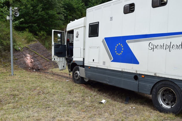 Einen nicht alltäglichen Unfall hat die Autobahnpolizei Kaiserslautern am Sonntagmittag aufgenommen. Der Fahrer eines Pferdetransporters war auf der A62 an der Einfahrt zum Hörnchenbergtunnel von der Fahrbahn abgekommen, überfuhr die Schutzplanken und krachte gegen das nördliche Tunnelportal. Nach seinen Angaben hätte er beim Trinken aus einer Wasserflasche einem starken Hustenanfall erlitten und dadurch die Kontrolle über seinen Lkw verloren. Der 36 jährige Unfallfahrer und das transportierte Pferd blieben glücklicherweise unverletzt. Es entstand ein Sachschaden in Höhe von 15.000 Euro.