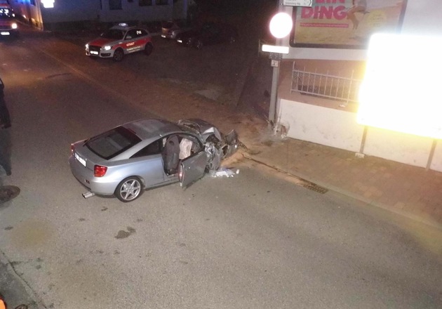Ein 22-jähriger Pkw-Fahrer befuhr am frühen Sonntagmorgen die Elschbacher Straße in Bruchmühlbach-Miesau in Richtung Ortsmitte. Laut Zeugenaussagen fuhr er deutlich zu schnell. An der Einmündung zur St.-Wendeler-Straße fuhr er ungebremst über die Straße hinweg und prallte gegen einen Laternenmast und anschließend gegen eine Hofmauer. Hierbei verletzten sich der Fahrer und die beiden 20- und 24-jährigen Mitfahrer schwer. Der Gesamtsachschaden dürfte sich auf ca. 7000 Euro belaufen. Da der Pkw-Führer deutlich unter Alkoholeinfluss stand, wurde eine Blutentnahme angeordnet sowie der Führerschein sichergestellt. Dem Mann droht nun eine Anzeige wegen Gefährdung des Straßenverkehrs.