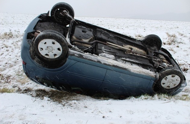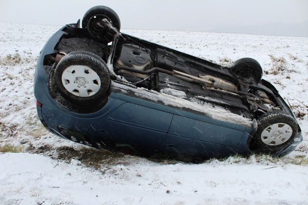 Junge Frau rutscht mit ihrem PKW in den Straßengraben und überschlägt sich. Am Sonntagmittag fuhr eine 22 jährige Fahrerin mit ihrem PKW von Odernheim in Richtung Lettweiler. In einem Gefällbereich konnte sie auf glatter Straße ihren Opel Meriva nicht mehr auf der Straße halten und rutschte in den Straßengraben. Dort überschlug sie sich mit dem Auto und blieb auf dem Dach liegen. Sie konnte noch selbst den Rettungsdienst verständigen. Beim Unfall erlitt sie leichte Verletzungen und wurde vorsorglich vom Rettungsdienst ins Krankenhaus gebracht. Das Auto der Fahrerin war nicht mehr fahrbereit und musste von einem Abschleppdienst abgeschleppt werden. Die K 78 wurde von der Polizei bis zum Eintreffen des Streudienstes gesperrt.