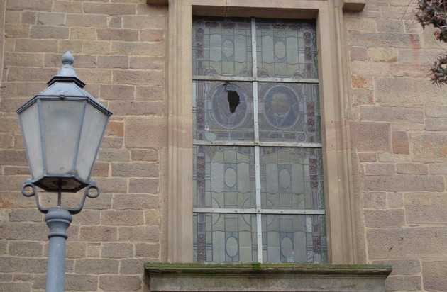 Im Tatzeitraum vom 31.12.2017 bis 06.01.2018 kam es zur Sachbeschädigung an der evangelischen Kirche in der Luitpoldstraße Kusel. Bislang unbekannter Täter warf mit einer Bierflasche ein Fenster der evangelischen Kirche ein. Hierbei wurde ein handgefertigtes Glasbild von 1922 zerstört. Der Schaden liegt im vierstelligen Bereich. Gibt es Zeugen der Tat? Hinweise bitte an die Polizei Kusel unter 06381-919-0 oder per E-Mail unter pikusel@polizei.rlp.de.