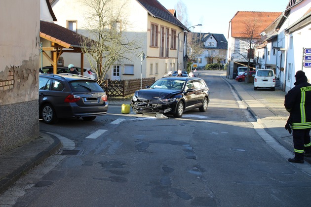 Bei tiefstehender Sonne sind am Sonntagnachmittag zwei PKW zusammengestoßen. Der vorfahrtsberechtigte Verkehrsteilnehmer wurde leicht verletzt. Der Gesamtschaden an den beiden Wagen wird auf 30.000 Euro geschätzt. Die Feuerwehr nahm ausgelaufene Betriebsstoffe auf. Beide Fahrzeuge mussten abgeschleppt werden. Der ortsunkundige 29-jährige Fahrer eines BMW befuhr die Lochgasse in Richtung der Straße "Im Eck". Beim Abbiegen übersah er den auf der Hauptstraße entgegenkommenden vorfahrtsberechtigten VW.