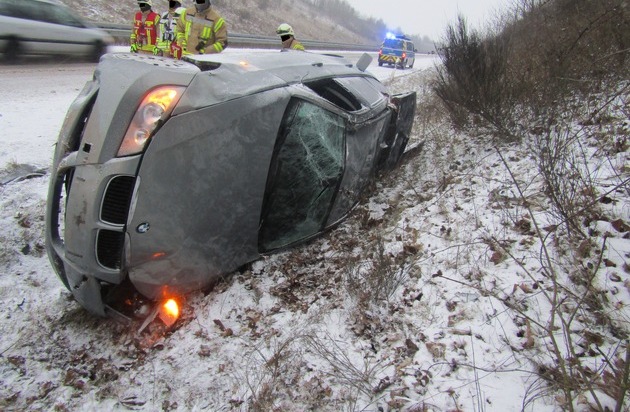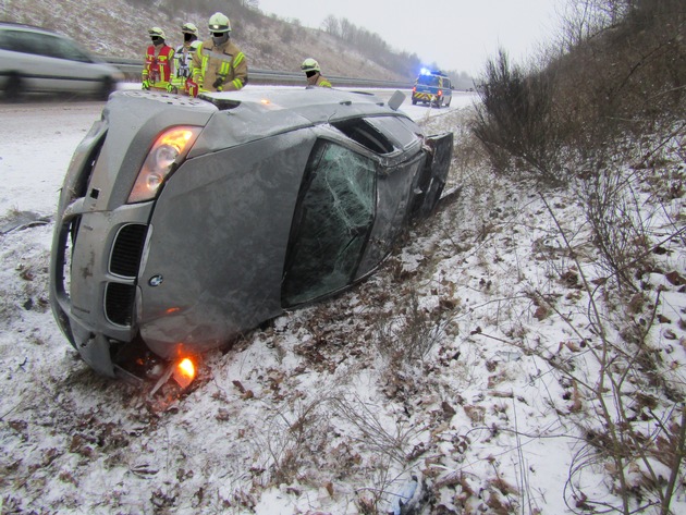 Am Sonntagmorgen, um 06:30 Uhr verlor auf der A 63 Richtung Mainz, kurz vor der Ausfahrt Göllheim ein 40-jähriger Pkw Fahrer infolge nicht angepasster Geschwindigkeit auf schneeglatter Fahrbahn die Kontrolle über seinen Wagen. Der Pkw rutschte nach rechts von der Fahrbahn und überschlug sich im angrenzenden Böschungsbereich. Der Fahrer wurde hierbei leicht verletzt. Am Pkw entstand Totalschaden. Zur Bergung des Pkw musste die A 63 kurzfristig halbseitig gesperrt werden. Im Einsatz war auch die Feuerwehr Winnweiler.