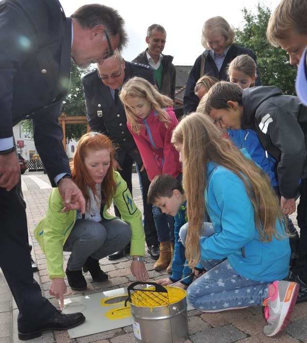Die Aktion "Gelbe Füße" ist am heutigen Freitag in Hochspeyer und Frankenstein offiziell an den Start gegangen. Schon seit ein paar Tagen ziehen sich die gelben Fußspuren durch die beiden Orte bis hin zur Grundschule. Heute durften die Kinder selbst noch ein paar dieser Spuren hinzufügen und somit ihren eigenen Schulweg sicherer machen. Denn mit den Fußspuren wird ihnen angezeigt, auf welchem Weg sie am ungefährlichsten zur Schule kommen, wo sie stehen bleiben müssen und wo sie am besten die Straße überqueren.