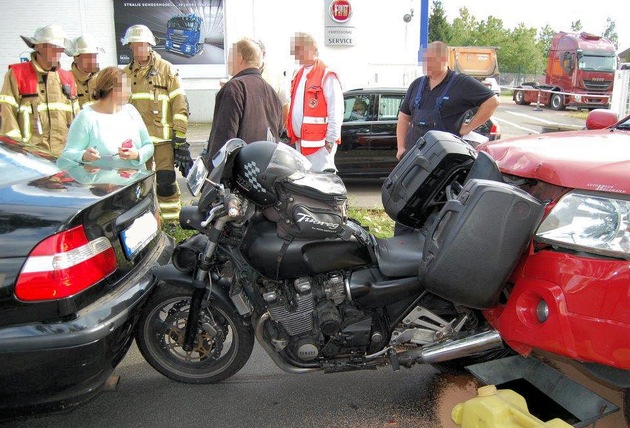 Zu dem Unfall kam es kurz vor 16 Uhr, als ein Autofahrer in einem baustellenbedingten Engpass auf seinen Vordermann auffuhr, als dieser seinerseits wegen der Verkehrssituation gestoppt hatte. Durch die Wucht des Aufpralls wurde dieser Pkw auf das davor haltende Motorrad geschoben, das dadurch wiederum gegen das davor stehende Fahrzeug gedrückt wurde. Das Motorrad wurde dabei so zwischen den beiden Wagen eingeklemmt, dass es nicht einmal umfiel.