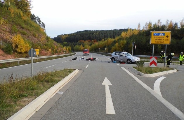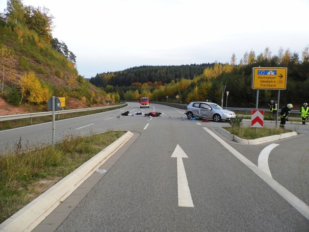 Am Samstagnachmittag, gegen 16:30 Uhr kam es bei Hochspeyer auf der B37 an der Einmündung zur B48 zu einem schweren Verkehrsunfall, bei dem ein 58-jähriger Rollerfahrer schwerste Verletzungen erlitt. Nach bisherigen Feststellungen der Polizei befuhr eine 33-jährige Fahrerin eines VW Golf die B37 von Frankenstein kommend in Richtung Hochspeyer. An der Einmündung zur B48 wollte sie nach links auf die B48 abbiegen, wobei sie den entgegenkommenden Rollerfahrer übersah. Im Einmündungsbereich kam es zur Kollision der Fahrzeuge, wobei der Rollerfahrer lebensgefährliche Verletzungen davontrug. Er wurde mit einem Rettungshubschrauber ins Krankenhaus gebracht. Die PKW-Fahrerin erlitt einen Schock. Zur Rekonstruktion des Unfalles wurde ein Gutachter hinzugezogen. Die B37 war während der Unfallaufnahme für zirka 2 Stunden voll gesperrt. Neben der Polizei und dem Rettungsdienst waren auch die Feuerwehren von Frankenstein und Hochspeyer im Einsatz.