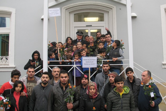 Für eine Überraschung haben am Mittwochmorgen rund 70 Flüchtlinge gesorgt, die gegen 10 Uhr die Polizeiinspektion Kusel besucht haben um sich bei den Beamtinnen und Beamten zu bedanken. Bei der Personengruppe handelte sich um Frauen, Kinder, junge Männer und Ehepaare, die derzeit noch in der Aufnahmeeinrichtung für Asylsuchende (Afa) Kusel leben und demnächst in anderen Landkreisen und Städten untergebracht werden. Mit der Aktion wollten sie sich bei der Polizei Kusel und insbesondere beim Bezirksbeamten Dieter Morgenstern für die gute Betreuung und Gastfreundschaft bedanken und überreichten den Polizistinnen und Polizisten Blumen. Die Afa gehört zum Zuständigkeitsbereich des Bezirksbeamten, der sichtlich gerührt war: "Ich habe mich riesig gefreut und fühle mich in meiner Handlungsweise bestätigt", erklärte Morgenstern nach dem Überraschungsbesuch. An den überreichten Rosen Papieranhänger angebracht, auf denen in verschiedenen Sprachen stand: "Danke Deutschland - Danke Kusel!" Nach dem Besuch bei der Polizei zog die Gruppe weiter, um sich in Geschäften und anderen Einrichtungen ebenfalls "Danke" zu sagen.