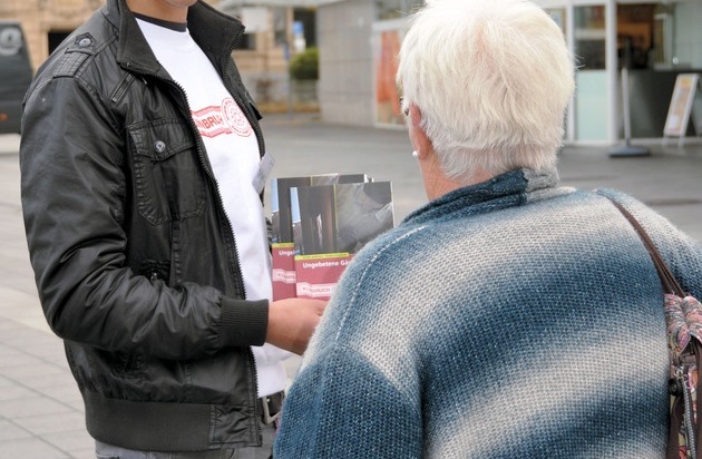 Menschen von Jung bis Alt wurden von Polizeibeamtinnen und -beamten des Polizeipräsidiums Westpfalz und der Bereitschaftspolizei zusammen mit Vertretern der Leitstelle Kriminalprävention des Innenministeriums und Vertretern der Initiative "Sicheres Kaiserslautern" sowie Studenten der Universität und der Fachhochschule Koblenz am heutigen Mittwoch in der Fußgängerzone in Kaiserslautern angesprochen und Informationsmaterial zum Thema Einbruchschutz verteilt. Dabei ergaben sich zahlreiche Gespräche und Beratungen.