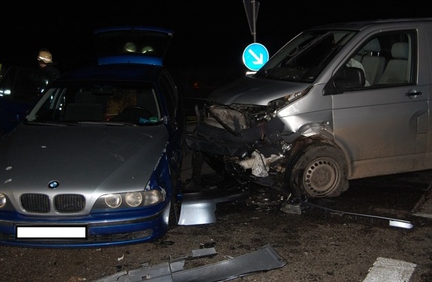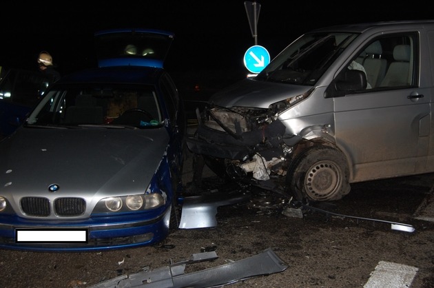 Am Dienstagabend gegen 17:40 Uhr ereignete sich auf der L401 an der Einmündung L382 (Baalbornerkreuz) ein Verkehrsunfall, bei dem drei Personen leicht und eine schwer verletzt wurden. Die 54-jährige Führerin eines Opel Astra wollte an der Einmündung nach links abbiegen und missachtete den Vorrang eines entgegenkommenden VW Transporters. Es kam zur Frontalkollision, wobei der VW durch die Wucht des Aufpralles gegen einen an der Einmündung verkehrsbedingt wartenden BMW geschleudert wurde. An allen drei beteiligten Fahrzeugen entstand Totalschaden. Alle beteiligten Fahrzeugführer und der Beifahrer in dem VW wurden verletzt und in umliegende Krankenhäuser eingeliefert. Bis auf die Verursacherin, die schwerer verletzt ist, konnten mittlerweile alle Verletzten wieder das Krankenhaus verlassen. Der entstandene Sachschaden wird auf zirka 20.000 Euro geschätzt. Neben der Polizeiinspektion Kaiserslautern 1 waren auch die Freiwillige Feuerwehr Enkenbach-Alsenborn, der Rettungsdienst mit mehreren Rettungswagen, die Straßenmeisterei und die Berufsfeuerwehr Kaiserslautern mit einem Spezialreinigungsfahrzeug im Einsatz. Während der Unfallaufnahme, der Bergung der Fahrzeuge und der Reinigung der Fahrbahn war die Einmündung "Baalbornerkreuz" bis 20 Uhr voll gesperrt