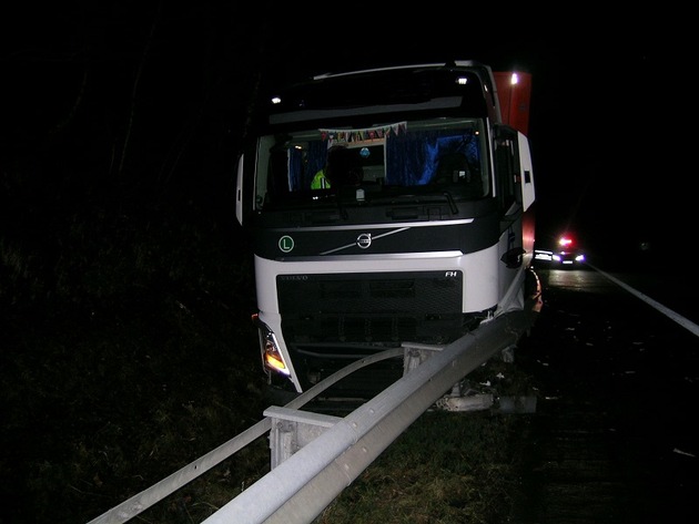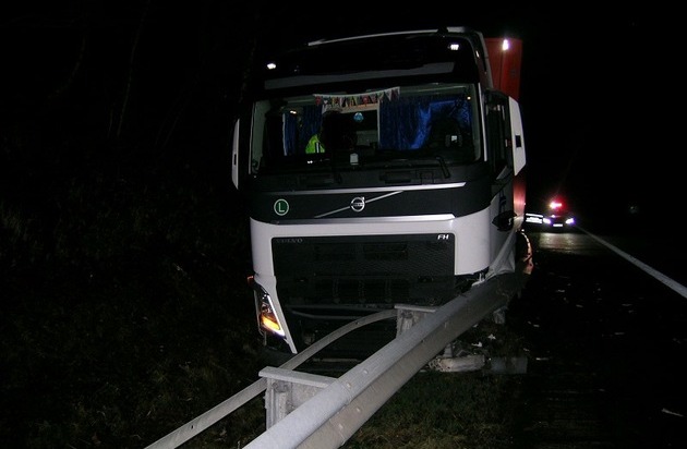 Am 12.12.2015 gegen 22:20 Uhr meldete eine aufmerksame Verkehrsteilnehmerin, dass ein großer LKW auf der BAB 6 Richtung Mannheim, kurz hinter der Anschlussstelle Enkenbach-Alsenborn hinter einer Leitplanke stünde. Tatsächlich fanden die Beamten vor Ort einen 40-Tonner, der durch seinen Fahrer 30 Meter hinter die dort befindliche Schutzplanke gesteuert wurde.Der Fahrer gab an, eine ihm heruntergefallene Flasche habe aufheben zu wollen, wobei er offenbar das Lenkmanöver vollzog, welches zur kuriosen "Parksituation" führte. Da sich die Bergungsarbeiten relativ aufwendig gestalten werden, werden diese erst bei Tageslicht am Sonntag den 13.12.2015 durchgeführt. Auf dem Auflieger prangerte im Übrigen der Schriftzug "Sure we can"....