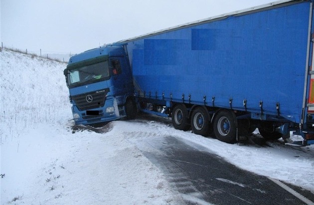 Am Freitag, 15.01.2016, gegen 13.00 Uhr befuhr ein 41-jähriger französischer LKW-Fahrer mit seiner Zugmaschine Mercedes-Benz Actros sowie Auflieger die L 700 vom Flughafen Zweibrücken kommend in Fahrtrichtung Hornbach. Auf der abschüssigen Strecke kam der Zug aufgrund nicht angepasster Geschwindigkeit auf winterglatter Fahrbahn in einer Rechtskurve ins Rutschen und brach nach links aus. Hierbei drehte sich das Führerhaus des Sattelzuges und verkeilte sich. Das Führerhaus rutschte auf der schneeglatten Fahrbahn nach links in den Graben, während der Auflieger quer auf der Fahrbahn zum Stehen kam und diese komplett blockierte. Der Sachschaden dürfte sich auf ca. 10.000 Euro belaufen. Der Sattelzug wurde mittels eines speziellen Abschleppwagens mit Seilwinde geborgen. Aufgrund der Witterungsverhältnisse mussten die Bergungsarbeiten durch die Straßenmeisterei unterstützt werden. Die L 700 war für ca. fünf Stunden gesperrt.