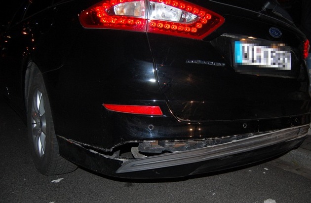 Vermutlich zwischen 20 Uhr und Mitternacht stieß der Unfallverursacher mit seinem Wagen gegen einen geparkten Ford Mondeo. Das Auto wurde an der hinteren Stoßstange beschädigt.