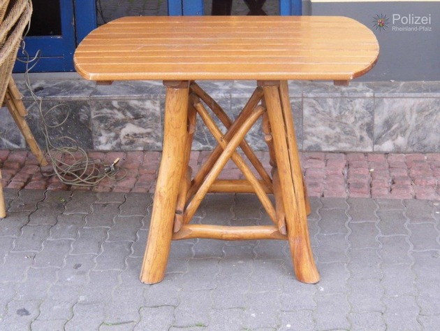 Mobiliar und Pflanzkübel im Wert von rund 1.500 Euro haben Unbekannte am frühen Mittwochmorgen vor einem Lokal in der Steinstraße entwendet. Die Täter rissen sich zwischen 4 Uhr und 7 Uhr zwei Tische und zwei Bänke aus naturfarbenem Eiche-Wurzelholz unter den Nagel, die vor der Gaststätte - mit einem Ringschloss gesichert - standen. Zudem nahmen sie einen etwa einen Meter hohen Pflanzkübel mit. Der Abtransport dürfte aufgrund der Größe und des Gewichts der Gegenstände von mindestens zwei Personen und mit einem geeigneten Fahrzeug erfolgt sein. Mögliche Zeugen werden gebeten, sich unter der Nummer 0631 369-2150 mit der Polizei in Verbindung zu setzen.
