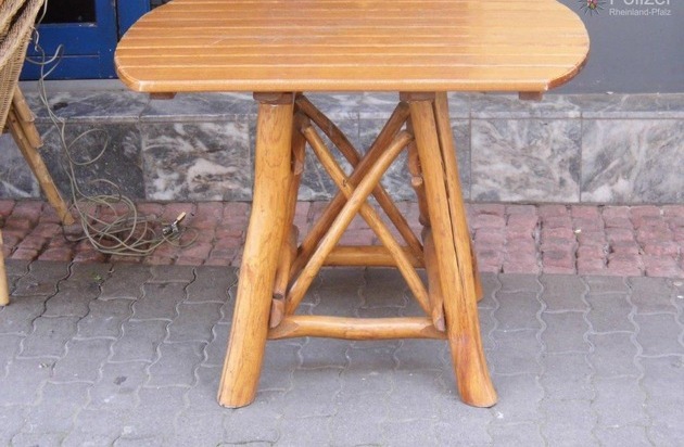 Mobiliar und Pflanzkübel im Wert von rund 1.500 Euro haben Unbekannte am frühen Mittwochmorgen vor einem Lokal in der Steinstraße entwendet. Die Täter rissen sich zwischen 4 Uhr und 7 Uhr zwei Tische und zwei Bänke aus naturfarbenem Eiche-Wurzelholz unter den Nagel, die vor der Gaststätte - mit einem Ringschloss gesichert - standen. Zudem nahmen sie einen etwa einen Meter hohen Pflanzkübel mit. Der Abtransport dürfte aufgrund der Größe und des Gewichts der Gegenstände von mindestens zwei Personen und mit einem geeigneten Fahrzeug erfolgt sein. Mögliche Zeugen werden gebeten, sich unter der Nummer 0631 369-2150 mit der Polizei in Verbindung zu setzen.