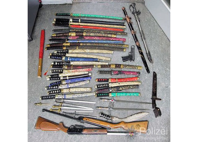 Weil zu erkennen war, dass von der kaputten Scheibe noch größere Fragmente im Fensterrahmen hingen und drohten , auf die Straße zu fallen, musste die Wohnung zwecks Gefahrenbeseitigung betreten werden. In den Räumen entdeckten die Beamten ein "Waffenarsenal" - sichergestellt wurden 28 Samurai-Schwerter, zwei Macheten, acht größere und kleinere Schwerter, ein Dolch, zwei Luftgewehre und eine Schreckschusspistole. Ob Verstöße gegen das Waffengesetz vorliegen, wird derzeit geprüft.