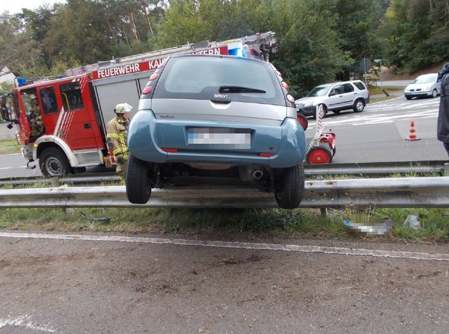 Ein 18-jährige Autofahrer aus dem Landkreis fuhr mit seinem Smart auf der Mannheimer Straße stadtauswärts, als ein 40-Jähriger mit seinem Wagen vom Gelände der Panzerkaserne fuhr und nach links, stadteinwärts abbog. Der US-Amerikaner missachtete dabei die Vorfahrt des Kleinwagens. Der 18-Jährige konnte nicht mehr bremsen, wich nach links auf und kollidierte mit der mittleren Schutzplanke. Durch die Wucht des Aufpralls landete das Auto auf der Mittelplanke und blieb dort total beschädigt liegen. Die Schadenshöhe wird auf etwa 6.000 Euro geschätzt. Am Wagen des 40-Jährigen entstand kein Schaden.