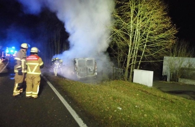 Glück im Unglück hatte ein 48-jähriger Autofahrer am frühen Samstagmorgen. Aufgrund eines Sekundenschlafes kam der Mann mit seinem Auto auf der L 502 kurz vor dem Ortsausgang Espensteig nach rechts auf den Grünstreifen und stieß mit der rechten Fahrzeugseite gegen einen Baum. Das Auto fing direkt an zu brennen. Der Fahrer konnte sich jedoch unverletzt aus dem Fahrzeug retten. Sein Auto brannte komplett ab. Der entstandene Schaden beläuft sich auf ca. 8000 Euro.