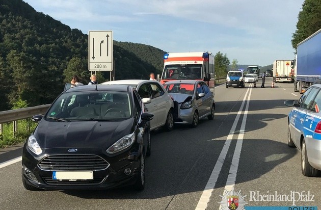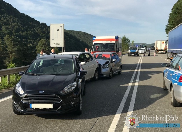 Zu dem Unfall kam es gegen 18:30 Uhr, als ein Autofahrer auf seinem Weg in Fahrtrichtung Pirmasens zwischen den Anschlussstellen Wilgartswiesen und Hauenstein verkehrsbedingt bremsen musste. Die Fahrer der beiden nachfolgenden Wagen erkannten die Situation offenbar zu spät und fuhren nacheinander auf.