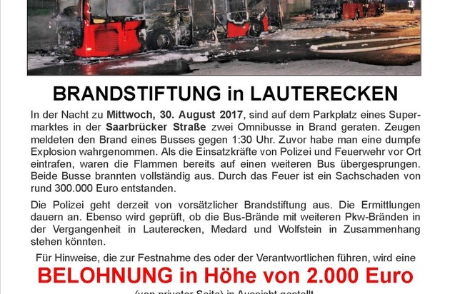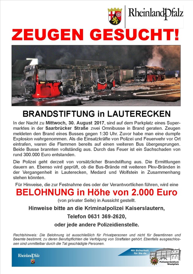 Eine Woche nach den Bus-Bränden in Lauterecken (wir berichteten) laufen die Ermittlungen der Kaiserslauterer Kriminalpolizei weiterhin auf Hochtouren. Die Ermittler sind bereits etlichen Hinweisen nachgegangen, es hat sich jedoch daraus kein konkreter Tatverdacht ergeben. Die Beamten hoffen, dass sich weitere Zeugen melden, denen in der Tatnacht vom 29. auf den 30. August 2017 etwas Verdächtiges aufgefallen ist. Sie werden gebeten, sich unter der Telefonnummer 0631 / 369-2620 mit der Kripo in Verbindung zu setzen.