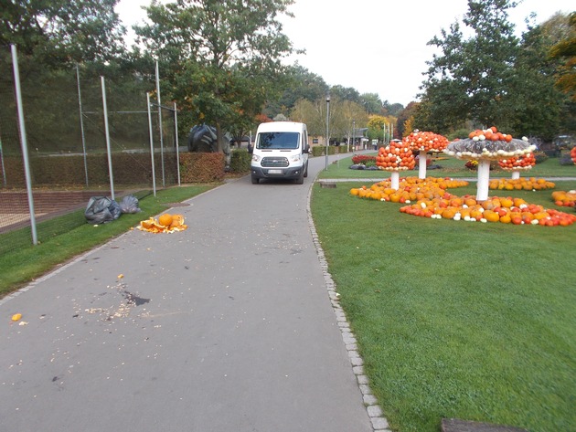 Unbekannte verschafften sich in der Nacht Zutritt zu dem Areal, auf dem zurzeit eine Kürbis-Ausstellung stattfindet. Im Bereich der Schlachthaus-Halle, unter der Berliner Brücke, stießen die Vandalen einen Blumenstock um und beschädigten drei Riesen-Kürbisse. Sie brachen das Fruchtfleisch der Kürbisse heraus. Außerdem zerstörten sie eine aus Kürbissen bestehende Fliegenpilzfigur. Etwa 50 mit Kabelbindern befestigte Kürbisse rissen sie ab und zerschmetterten die Früchte auf dem Boden. Ein Hinweisschild wurde ebenfalls herausgerissen und in ein Blumenbeet geworfen. Die Polizei ermittelt wegen Sachbeschädigung.