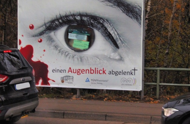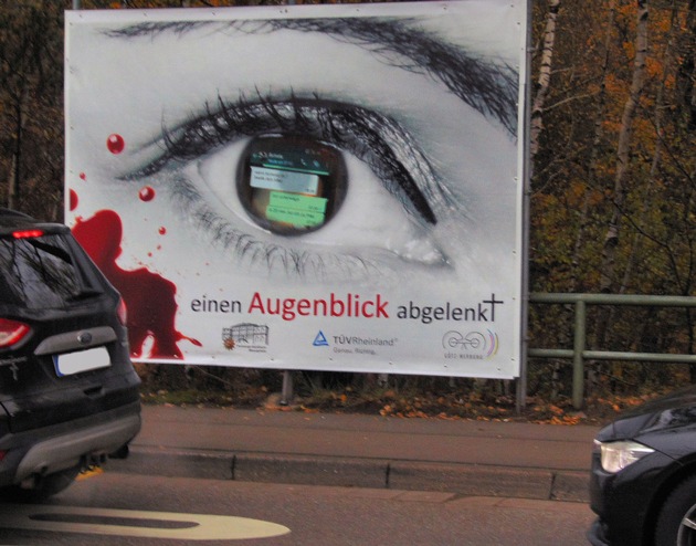 Das Auge auf dem Plakat, in dem sich solche Chat-Nachrichten spiegeln, soll symbolisch für diese Ablenkungen stehen. Und der rote (Blut-)Fleck daneben sagt aus, wie es in der Realität ist: Nicht selten werden Menschen verletzt - manche sogar tödlich - weil der Fahrer nicht bei der Sache war, sondern sich ablenken ließ.