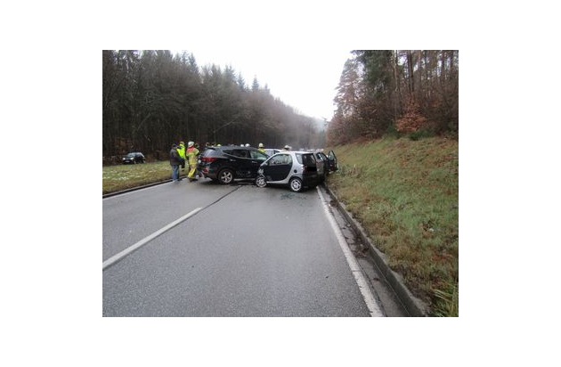 Am Freitagnachmittag ereignete sich ein Verkehrsunfall auf der L502 zwischen Kaiserslautern und Dansenberg mit mehreren Fahrzeugen. Hierbei wurde eine Person schwer verletzt, drei weitere wurden leicht verletzt. Ein 50-jähriger Mann befuhr mit seinem Fahrzeug die L502 von Dansenberg kommend in Richtung Kaiserslautern. Aus bisher ungeklärter Ursache geriet er in einer langgezogenen Linkskurve in den Gegenverkehr und prallte frontal auf das in entgegengesetzter Richtung fahrende Auto eines 65-jährigen Mannes. Die beiden nachfolgenden Wagen, die von einer 36-jährigen Frau und einem 48-jährigen Mann gefahren wurden und Richtung Dansenberg unterwegs waren, konnten nicht mehr ausweichen und prallten ebenfalls mit den unfallbeteiligten Fahrzeugen zusammen. Alle beteiligten Fahrzeuge waren jeweils nur mit dem Fahrer besetzt. Die verletzten Personen wurden durch Rettungskraftwagen in die Krankenhäuser Ludwigshafen, Pirmasens und Landstuhl gebracht. Die Straße wurde durch die Polizei und die Feuerwehr gesperrt. Der Verkehr wurde über den angrenzenden Waldparkplatz umgeleitet. Alle beteiligten Fahrzeuge waren nicht mehr fahrbereit und mussten abgeschleppt werden. Durch die Verkehrsunfallaufnahme und die Bergung der Fahrzeuge kam es zu erheblichen Verkehrsbeeinträchtigungen.