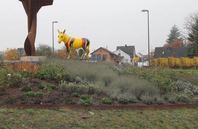 Am Sonntagvormittag wurde beanzeigt, dass der Esel Valentin, welcher in der Weinstraße in Eschbach aufgestellt war, durch unbekannte Täter über Nacht entwendet wurde. Am heutigen Montag wurde das Kunstwerk wohlbehalten aufgefunden. Die Entführer hatten den Esel nach Appenhofen verbracht und auf dem dortigen Verkehrskreisel aufgestellt. Hinweise auf die "Entführer" nimmt die Polizei Landau unter 06341-2870 oder per Email an die pilandau@polizei.rlp.de entgegen. Nach bisherigem Kenntnisstand entstand kein Schaden an dem Kunstwerk.