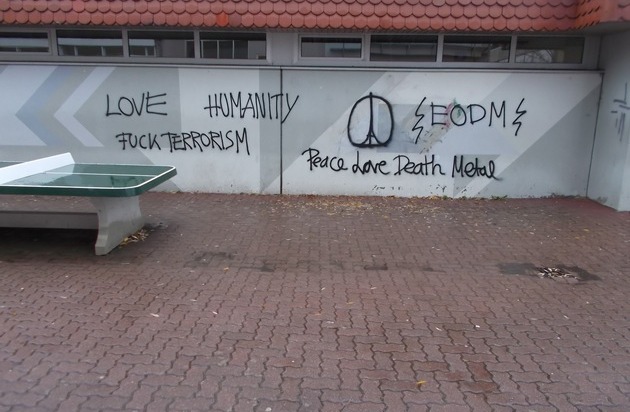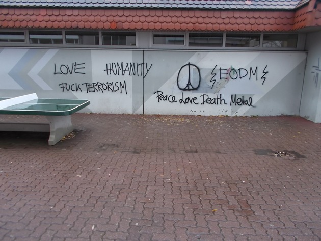 Die Schulsporthalle im Südring wurde Sonntag auf Montag vergangener Woche mit mehreren schwarzen Schriftzügen besprüht. Der oder die Täter sprühten "Fuck Terrorism", "Love Humanity", "Eodm", "Peace Love Death Metal". Der Sachschaden wird mit ca. 1500 Euro beziffert. Hinweise bitte an die Polizei Landau unter 06341-2870 oder an pilandau@polizei.rlp.de.