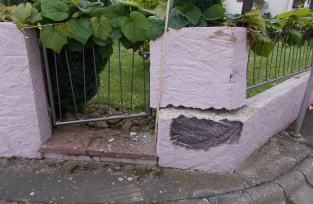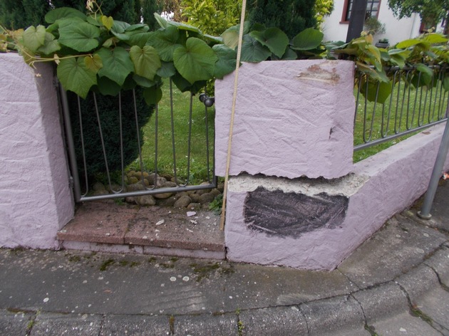 08.06.2016, 15.30 Uhr Ein aus Richtung Insheim kommender Lkw mit Anhänger folgte am Ortseingang von Rohrbach der Umleitungsbeschilderung und bog in die Schlesierstraße ab. Dabei berührte der Anhänger die Grundstücksmauer des Eckanwesens und beschädigte die Mauer (siehe Bild). Der Brummifahrer fuhr weiter ohne sich um den Schaden zu kümmern. Die Hausbesitzerin konnte den Vorfall aus ihrem Wohnzimmerfenster beobachten, jedoch nicht das Kennzeichen des Fahrzeuggespannes. Es ist lediglich bekannt, dass es sich um einen grauen Lkw mit grauem Anhänger gehandelt hat. Zeugen des Unfalls mögen sich bitte unter der Telefonnummer 06341-2870 melden.