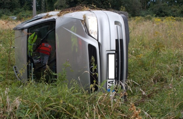 Wörth; Am 04.09.2016 befuhr um 17:00 Uhr ein PKW die BAB 65 von Landau nach Karlsruhe. Der 20-jährige Fahrer wollte an der AS Hagenbach von der BAB abfahren. Auf Grund nicht angepasster Geschwindigkeit kam der Fahrer in der Kurve von der Fahrbahn ab. Das Fahrzeug überschlug sich und blieb anschließend im Grünstreifen liegen. Die beiden Insassen wurden glücklicherweise nur leicht verletzt. Es entstand ein Sachschaden von ca. 10.000EUR.