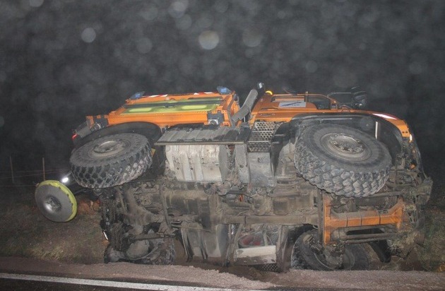 07. Dezember 2016, 6 Uhr Auf der Landstraße zwischen Böchingen und Landau-Nußdorf kam am Mittwochmorgen ein Streufahrzeug der Straßenmeisterei Godramstein auf spiegelglatter Fahrbahn von der Straße ab. Das Fahrzeug drehte sich um die eigene Achse und kippte dann auf der Bankette um (siehe Bild). Es entstand ein geringer Sachschaden. Der Fahrer blieb unverletzt. Die Straße war wegen der Bergung des Fahrzeuges bis um 9 Uhr gesperrt. Ein weiterer Unfall auf reifglatter Fahrbahn ereignete sich am Mittwochmorgen in der Breslauer Straße in Offenbach, als eine 71 jährige Radfahrerin stürzte und mit Verdacht auf Knöchelbruch ins Krankenhaus kam.