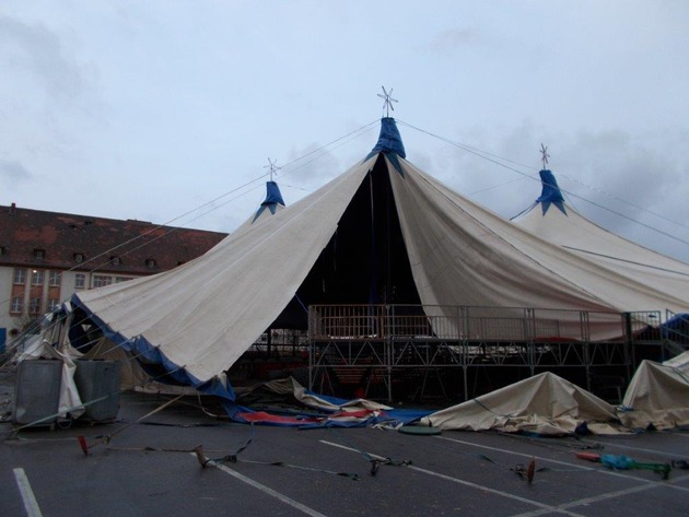 Landau: 13. Januar 2017 Das Sturmtief "Egon" bescherte der Polizei in der Nacht zahlreiche Einsätze. Ab 01.30 Uhr waren die Polizeibeamten im Dauereinsatz um witterungsbedingte Störungen zu dokumentieren und teilweise zu beheben. Durch die Sturmböen gab es mehrere Fehlalarme bei Supermärkten und öffentlichen Gebäuden. Der Schwerpunkt solcher Alarme lag im Bereich von Annweiler. Durch einen Stromausfall wurde auch die Tunnelsperrung des Löwenherztunnels aktiviert. Die Tunnelbereitschaft beseitigte die Störung. Der Sturm entwurzelte zwei Bäume. Der Baum der sich zwischen Wollmesheim und Ilbesheim über die Fahrbahn legte, konnte mit eigenen Mitteln beseitigt werden. Dagegen wurde die Feuerwehr für die Baumbeseitigung auf der Kreisstraße 40 am Ortsausgang von Offenbach im Kurvenbereich benötigt. Zwei Trampoline machten sich in Vorgärten selbstständig und flogen durch die Luft. In der Wilhelm-Schechstraße beschädigte das fliegende Trampolin eine Straßenlaterne, ehe das Fluggerät durch die Eigentümerin wieder eingefangen werden konnte. In Siebeldingen konnte das Trampolin durch die Polizeistreife eingefangen und auseinandergebaut werden. Den größten Sturmschaden wurde um 1.30 Uhr auf dem neuen Messplatz gemeldet. Der dortige Weihnachtszirkus drohte wegzufliegen. Feuerwehr und Technisches Hilfswerk waren über Stunden im Einsatz um das Tierzelt, wo Tiere untergebracht waren, und das Hauptzelt zu sichern. Durch zusätzliche Seitenstangen und Bodenverankerungen versuchte man die beiden Zelte vor Beschädigungen zu schützen, was lediglich beim Tierzelt gelang. Das Hauptzelt wurde beschädigt, indem die Dachplane durch den Wind einriss (siehe Bild). Der Besitzer schätzt den Schaden auf mindestens 300.000 Euro. Personen und Tiere wurden nicht verletzt.