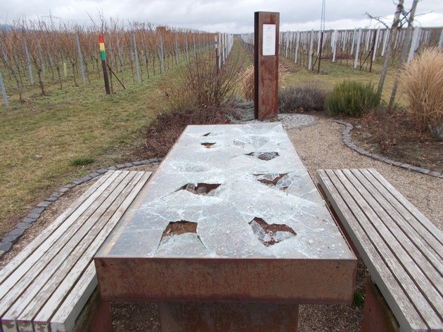Zwischen Landau und Nußdorf wurde die Glasplatte eines Tisches am Weinerlebnispfad mehrmals mutwillig eingeschlagen. Es entstand Sachschaden von ca. 800 Euro. Zeugen mögen sich bitte bei der Polizei Landau melden.