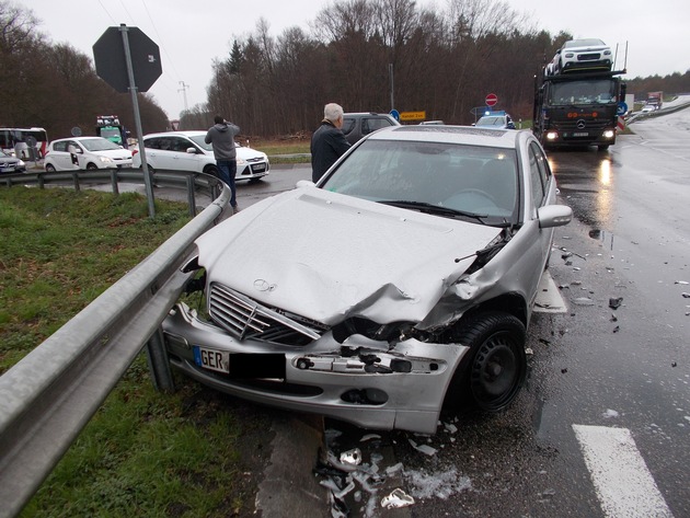 Kandel; Am 21.03.2017 befuhr um 15:35 Uhr ein 75-jähriger PKW Fahrer die L554 von Kandel in Richtung B9. An der Einmündung zur Bundesstraße missachtete der Fahrer die Vorfahrt eines von links kommenden PKW. Durch die Kollision wurden die beiden Fahrer leicht verletzt und wurden vorsorglich in ein Krankenhaus gebracht. Es entstand ein Sachschaden von ca. 10.000EUR.