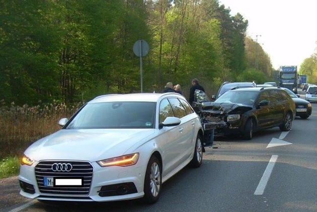 Wörth; Am 20.04.2017 um 08:55 Uhr befuhr eine PKW Fahrerin mit einem Mietwagen die B9 von Frankreich kommend in Richtung Kandel. Vor der Anschlussstelle Kandel-Süd wollte die Fahrerin abbremsen und unterschätzte hierbei die Leistung des neuen Oberklassewagens. Aufgrund der unfreiwilligen Vollbremsung fuhren zwei weitere Fahrer auf den PKW auf. Durch den Zusammenstoß wurden zwei Beteiligte leicht verletzt. Es entstand ein Sachschaden von ca. 20.000EUR