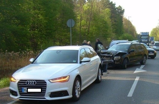 Wörth; Am 20.04.2017 um 08:55 Uhr befuhr eine PKW Fahrerin mit einem Mietwagen die B9 von Frankreich kommend in Richtung Kandel. Vor der Anschlussstelle Kandel-Süd wollte die Fahrerin abbremsen und unterschätzte hierbei die Leistung des neuen Oberklassewagens. Aufgrund der unfreiwilligen Vollbremsung fuhren zwei weitere Fahrer auf den PKW auf. Durch den Zusammenstoß wurden zwei Beteiligte leicht verletzt. Es entstand ein Sachschaden von ca. 20.000EUR