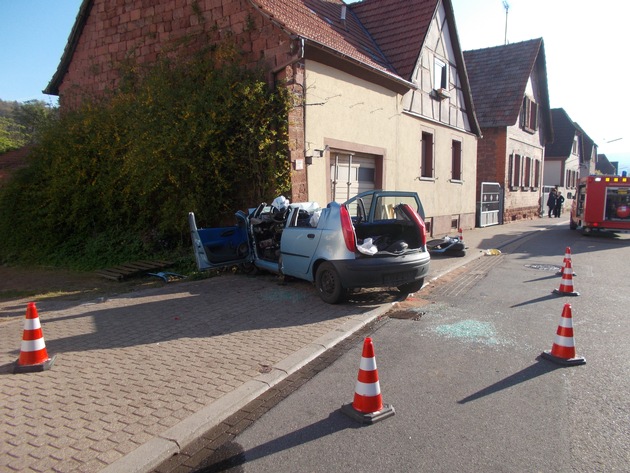 Bei einem Verkehrsunfall am Sonntagmorgen wurde ein 24-jähriger Südpfälzer schwer verletzt. Der verunfallte Pkw-Fahrer kam in einer Fahrbahnschwenkung in der Ortsdurchfahrt Queichhambach nach links von der Straße ab und prallte ungebremst frontal in eine Hausfassade. Durch den Aufprall musste der Fahrer durch die Feuerwehr Annweiler aus seinem Pkw befreit werden und wurde schwer verletzt, u.a. Rippenfrakturen und Beckenbruch in ein Landauer Krankenhaus verbracht. Durch das THW und die Feuerwehr wurde die einsturzgefährdete Fassade stabilisiert. Wie sich im Verlaufe der Unfallaufnahme herausstellen sollte, war der 24-jährige Fahrer nicht im Besitz eines Führerscheins und er dürfte unter Einfluss von Betäubungsmitteln und Alkohol gewesen sein. Zudem war der Unfallwagen nicht ordnungsgemäß zugelassen.