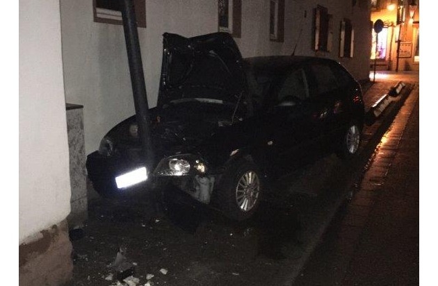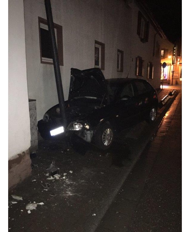 12. Dezember 2017, 20.10 Uhr Eine 26-jährige Frau aus Herxheim, erschrak beim Abbiegen in die Speiertsgasse vor einem im Gegenverkehr wartenden Linienbus. Statt zu Bremsen gab die Frau Vollgas und kam dadurch von der Fahrbahn ab. In der Speiertsgasse stieß sie zunächst an den Bordstein und eine Hauswand. Eine Straßenlaterne beendete die Fahrt der Frau in ihrem Seat Ibiza. Das Auto wickelte sich um die Laterne (siehe Bild). Das Auto erlitt einen Totalschaden. Verletzt wurde bei dem Unfall niemand. Der Gesamtschaden beträgt rund 15.000 Euro. Die Fahrerin war eine Fahranfängerin, die erst in diesem Jahr ihren Führerschein gemacht hat.
