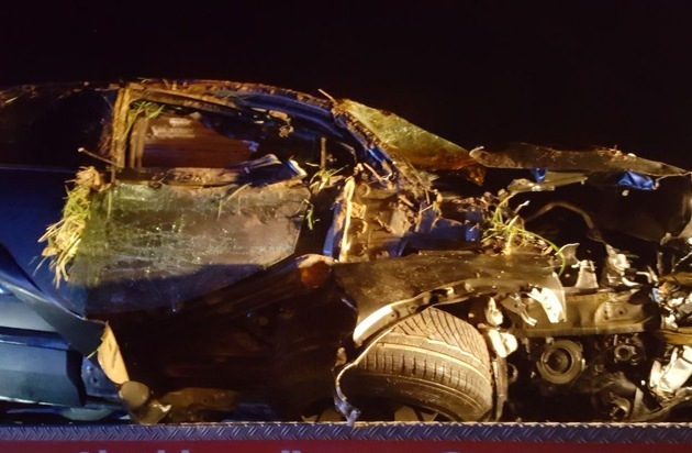22. April 2018, 00.54 Uhr In der Nacht von Samstag auf Sonntag verunglückte ein 33-jähriger Peugeot-Fahrer aus Herxheim auf der Kreisstraße zwischen Mörlheim und Insheim. In einer leichten Linkskurve kam er von der Straße ab, berührte ein Brückengeländer und fuhr anschließend gegen einen Baum. Das Auto hob ab, überschlug sich und kam auf dem Dach liegend zum Stillstand. Der Fahrer konnte sich selbstständig befreien. Angesichts des total zerlegten Wagens (siehe Bild) kam der Mann noch glimpflich davon. Mit Prellungen am Körper wurde er ins Krankenhaus gebracht. Sein Auto hatte nur noch Schrottwert. Ursächlich für den Unfall dürfte der genossene Alkohol (1,9 Promille) gewesen sein.
