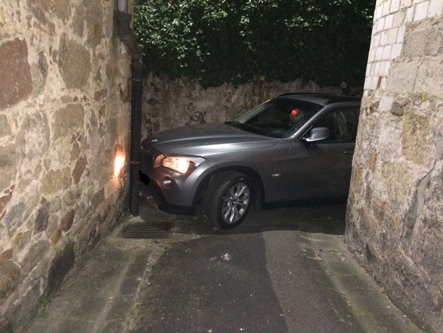 Eine Anwohnerin der Weinstraße in Edenkoben meldet, dass sich der Fahrer eines BMW in eine missliche Lage gebracht habe. Er fuhr nach Anweisung seines Navis in eine so enge Gasse, dass er in dieser regelrecht stecken blieb. Hierbei touchierte er eine Dachrinne und eine Mauer. Es entstand nur Sachschaden am Pkw ~ etwa 4000EUR. Es wurde auf Wunsch ein Abschlepper, verständigt, welcher den Pkw aus der Gasse hinaus manövrierte.