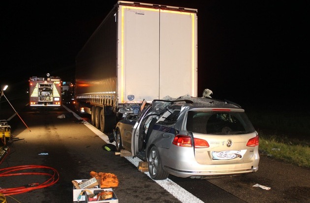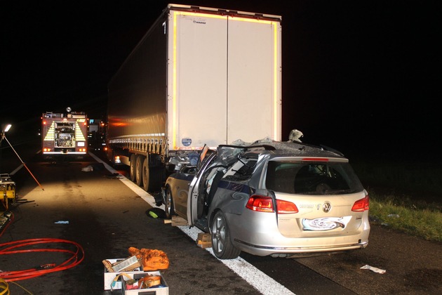 Am Donnerstag, 24.09.2015, gegen 01:50 Uhr, kam es auf der Autobahn 61 in der Nähe der Tank-und Rastanlage Dannstadt-West zu einem Verkehrsunfall, bei dem zwei Menschen verstarben. Nach bisherigem Ermittlungsstand fuhr der Fahrer eines Pkw aus dem Kreis Augsburg in Richtung Süden auf der Strecke zwischen dem Autobahnkreuz Mutterstadt und der Rastanlage Dannstadt ungebremst unter den Auflieger eines Sattelzuges, der auf dem rechten Fahrstreifen fuhr. Durch den Aufprall deformierte sich die Fahrgastzelle des Pkw VW-Passat erheblich und verkeilte sich unter dem Sattel-Auflieger. Der Pkw war mit fünf jungen Männern im Alter zwischen 19 und 20 Jahren besetzt, von denen zwei an der Unfallstelle verstarben. Zwei Schwerverletzte und ein leichter Verletzter kamen in Krankenhäuser in der Umgebung. Der 52-jährige Lkw-Fahrer aus dem Kreis Südliche Weinstraße erlitt einen Schock. An den Fahrzeugen entstanden Sachschäden in Höhe von ca. 40.000 Euro. Zur Klärung des genauen Unfallherganges werden die Daten des EG-Kontrollgerätes des Sattelzuges ausgewertet und ein Sachverständiger zugezogen. Die Autobahn 61 war Richtung Speyer bis gegen 08:00 Uhr gesperrt. Der Verkehr wurde örtlich umgeleitet. Es kam zu ca. zwei Kilometern Rückstau.