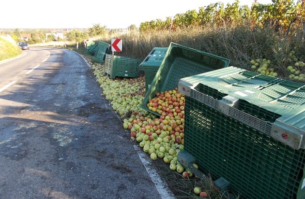 Äpfel auf der Fahrbahn Ein 52-jähriger Fahrer eines Traktors mit zwei Rollen, auf denen sich Äpfeln befanden, befuhr am 28.09.15, gegen 08:20 Uhr, die L 454 aus Richtung Birkenheide kommend in Richtung Weisenheim am Sand. In der Linkskurve kurz vor Weisenheim am Sand kam die hintere Rolle, vermutlich auf Grund eines Defekts an der Bremse ins Schlingern und kippte um, so dass die komplette Ladung ordnungsgemäß gesicherter Äpfel auf die Fahrbahn fiel. Der Fahrer konnte den Hänger mit Hilfe des Traktors wieder aufrichten und das Gespann von der Fahrbahn fahren. Die Ladung (ca. 2,5 t Äpfel) wurden von Helfern, die der 52-Jährige organisiert hatte, von der Fahrbahn und dem Fahrbahnrand aufgesammelt. Die verständigte FFW Weisenheim/Sand reinigte die Fahrbahn und streute einen Ölfleck ab. Sie waren mit 2 Fahrzeugen und 10 Mann vor Ort. Während der Fahrbahnreinigung musste die L 454 komplett gesperrt werden. Eine weitere Stunde war eine Teilsperrung nötig, um die das Aufsammeln der Äpfel gefahrenfrei durchführen zu können. Der entstandene Schaden steht noch nicht fest.
