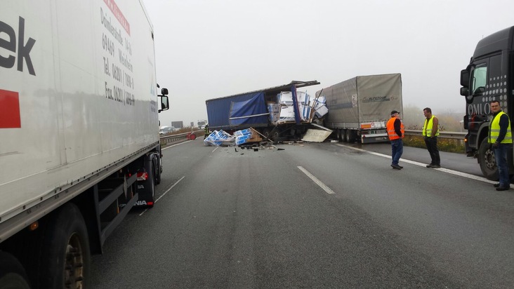 Neuer Verkehrsunfall auf der A6 zwischen AS Grünstadt und AS Wattenheim. 4 LKW und 1 PKW beteiligt. 1 Fahrer eingeklemmt. Vermutlich 1 Person schwer verletzt. Zurzeit Vollsperrung der A6. Rettungskräfte, Feuerwehr und Polizei im Einsatz. Sperrung und Bergung werden mehrere Stunden andauern. Die Staatsanwaltschaft hat die Entsendung eines Unfallgutachters angefordert. Wenn neue Informationen vorliegen, wird nachberichtet. Bitte derzeit keine telefonische Anfragen an die hiesige Wache. Wir danken für Ihr Verständnis.